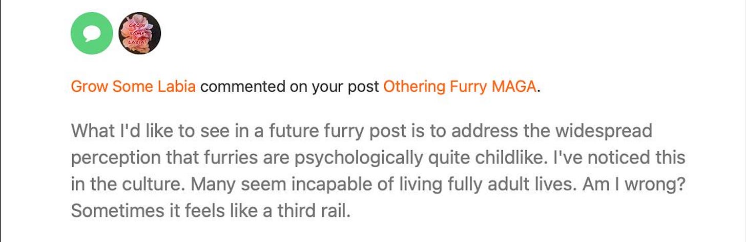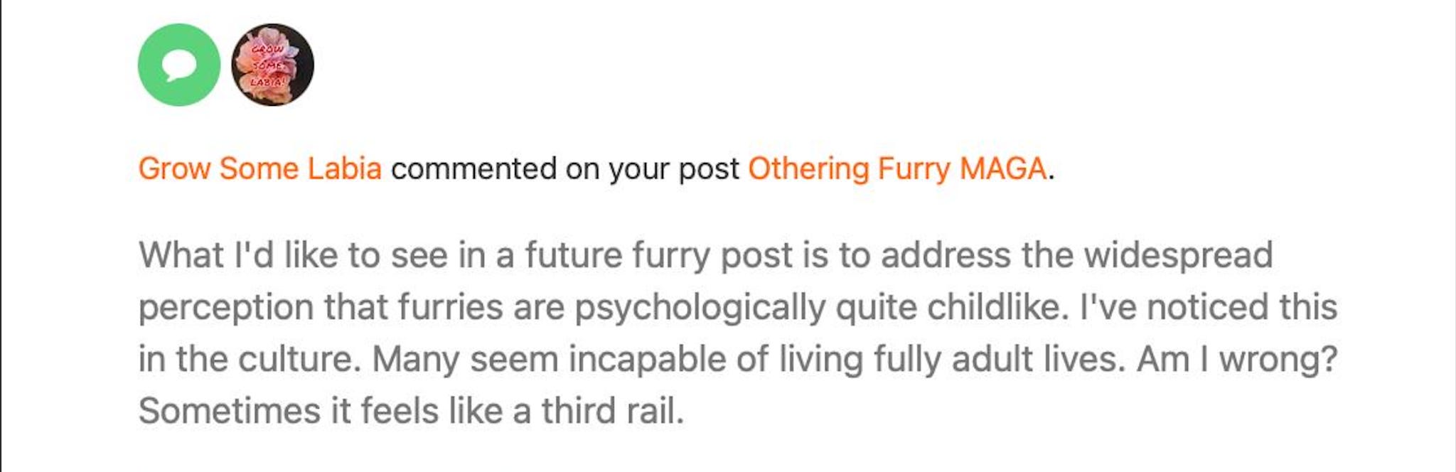 I will caution my readers to exercise the best discretion they have ever practiced in their lives. This is far from universal, but is a trajectory that individual furries can take. However, if they are immature I will assure you that at least one of these dynamics are at play.